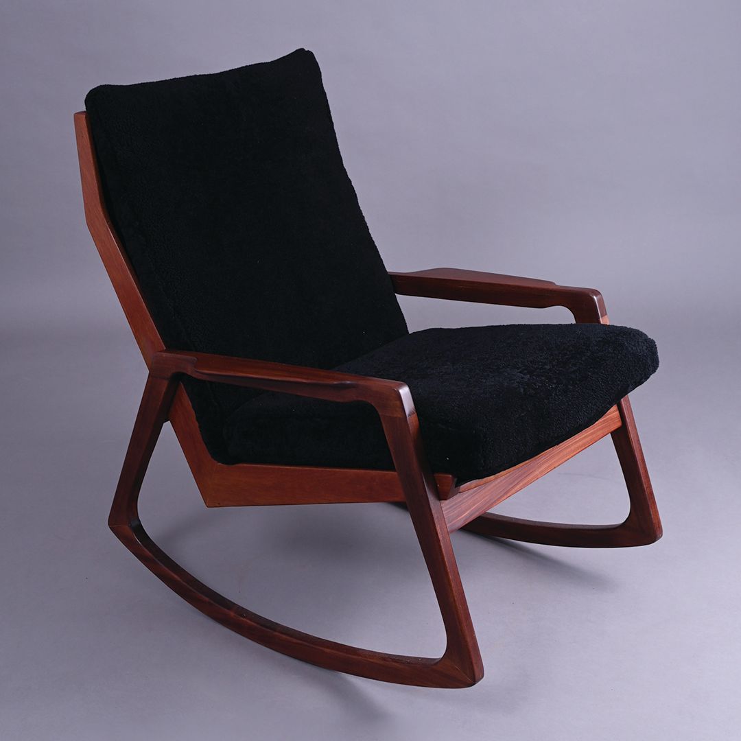 Afromosia framed rocking chair. Reupholstered in black leather and black sheepskin. Circa 1960's.