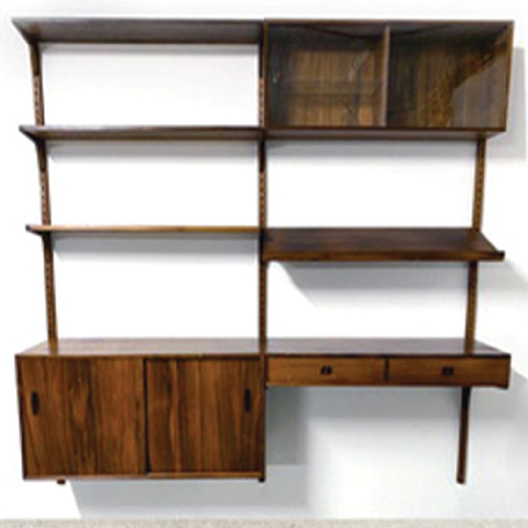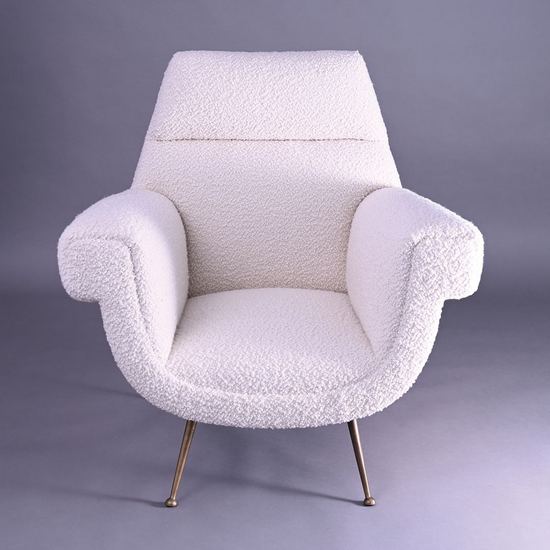 The refurbished Afromosia frame is finished with brass fittings and reupholstered in luxurious, textured boucle fabric.